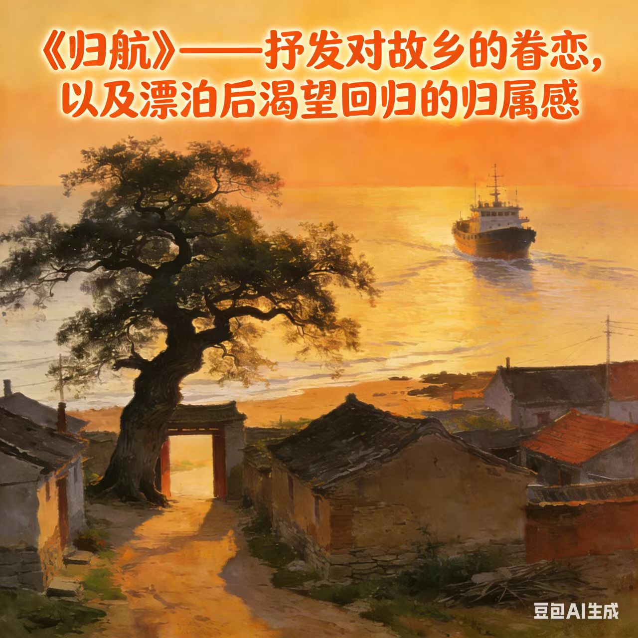 诗歌以“船归港湾”喻指人归故乡,用“穿人海、越山川”的描写,写出漂泊的艰辛。“村口老槐树”的意象,唤醒对家的记忆,结尾“我回来了”的安然,道尽归属感的珍贵,情感从漂泊的疲惫,转向归家的温、