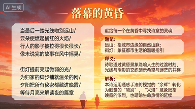 3. 《咖啡馆的下午》 主题:在咖啡馆的慵懒午后,享受独处的宁静与内心的丰盈。题记:一杯咖啡,一本书,一个下午,就是全世界。正文阳光穿过玻璃窗在桌面上,画着金色的格子我点了一杯拿铁奶泡上的拉花像一朵盛开的云翻开书,时间就慢了下来每一个字,都像一颗温柔的子弹击中我,内心最柔软的地方 注释 • 拿铁:一种咖啡饮品,由浓缩咖啡和牛奶混合而成,常带有精美的拉花。 • 温柔的子弹:比喻文字的力量,既温柔又深刻,能触动人心。 释义阳光穿过咖啡馆的玻璃窗,在桌面上画出金色的格子。我点了一杯拿铁,奶泡上的拉花像一朵盛开的云。翻开书,时间仿佛慢了下来,每一个字都像一颗温柔的子弹,击中我内心最柔软的地方。解析诗人以 “咖啡馆的下午” 为场景,营造了一个慵懒而宁静的氛围。“金色的格子”“盛开的云” 等细节,充满了视觉美感。“温柔的子弹” 的比喻,生动写出了文字的力量,表达了独处时的内心丰盈与精神满足。 要不要我帮你把这些诗歌