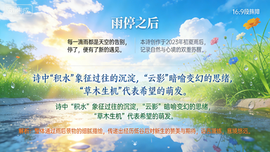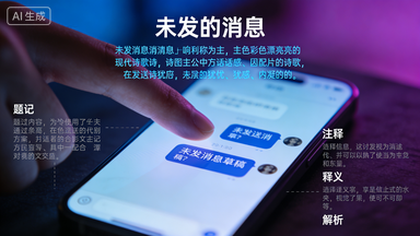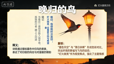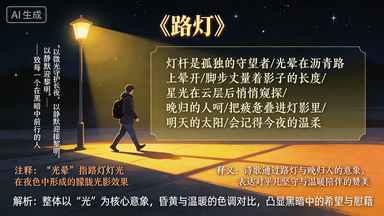 注释 • 站牌:城市公共交通的标志,象征着等待与出发。 • 彩色的鱼:比喻公交车在城市街道上穿梭的灵动姿态。 释义我在公交站牌下等车,风吹乱了我的头发,就像一个大大的问号。一辆辆公交车驶过,像彩色的鱼一样游向远方。我突然明白,等车不只是为了乘坐交通工具,更是在等待一个刚好的时间,和一个刚好的人,共同开启一段未知的旅程。解析诗人将 “等车” 这一日常场景赋予了哲学意味。“头发吹成了问号” 的细节,生动写出了等待时的迷茫与期待。“彩色的鱼” 的比喻,为单调的都市生活增添了诗意。结尾 “刚好的时间”“刚好的人”,则将等待的偶然转化为对命运的温柔期许。