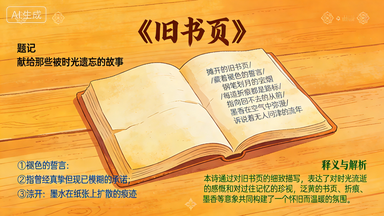 注释 • 拿铁:一种咖啡饮品,由浓缩咖啡和牛奶混合而成,常带有精美的拉花。 • 温柔的子弹:比喻文字的力量,既温柔又深刻,能触动人心。 释义阳光穿过咖啡馆的玻璃窗,在桌面上画出金色的格子。我点了一杯拿铁,奶泡上的拉花像一朵盛开的云。翻开书,时间仿佛慢了下来,每一个字都像一颗温柔的子弹,击中我内心最柔软的地方。